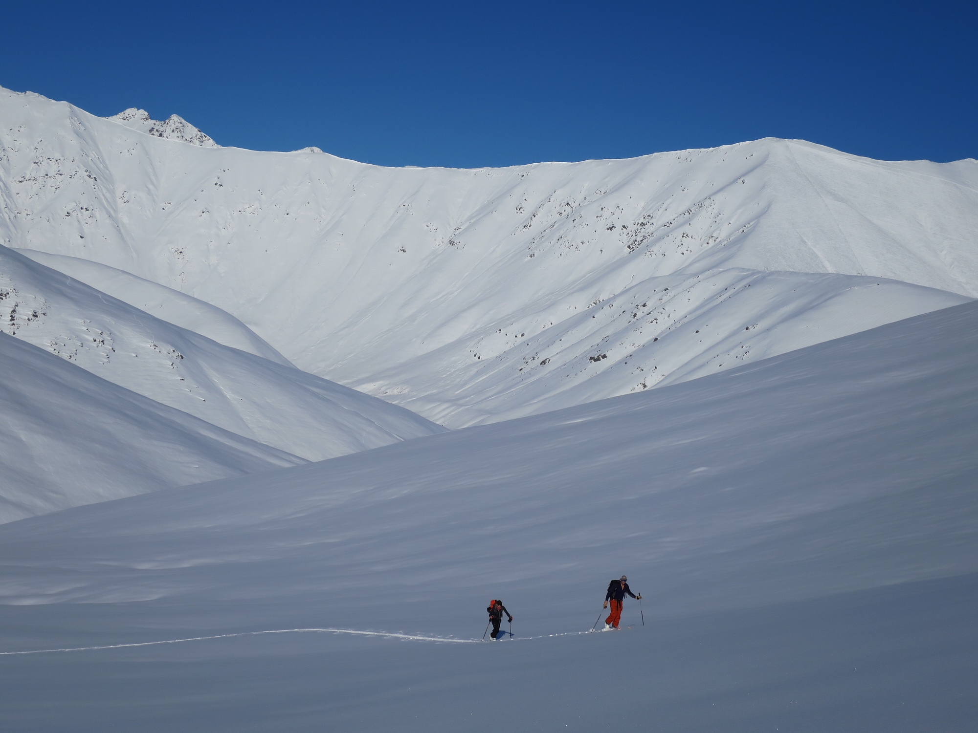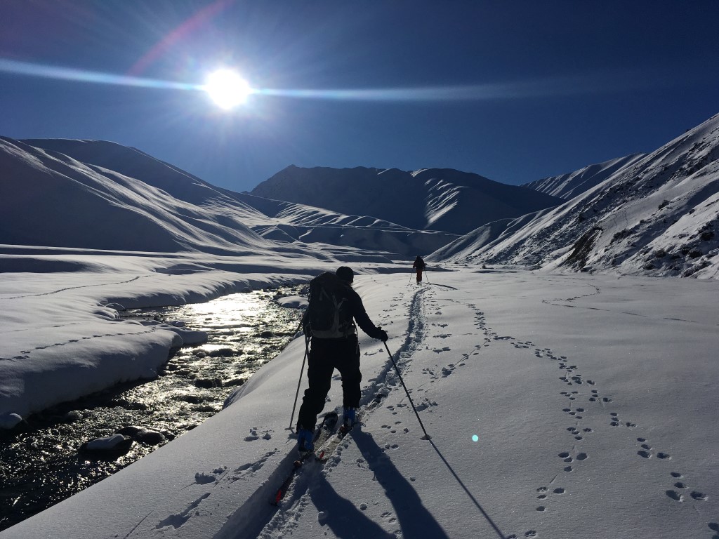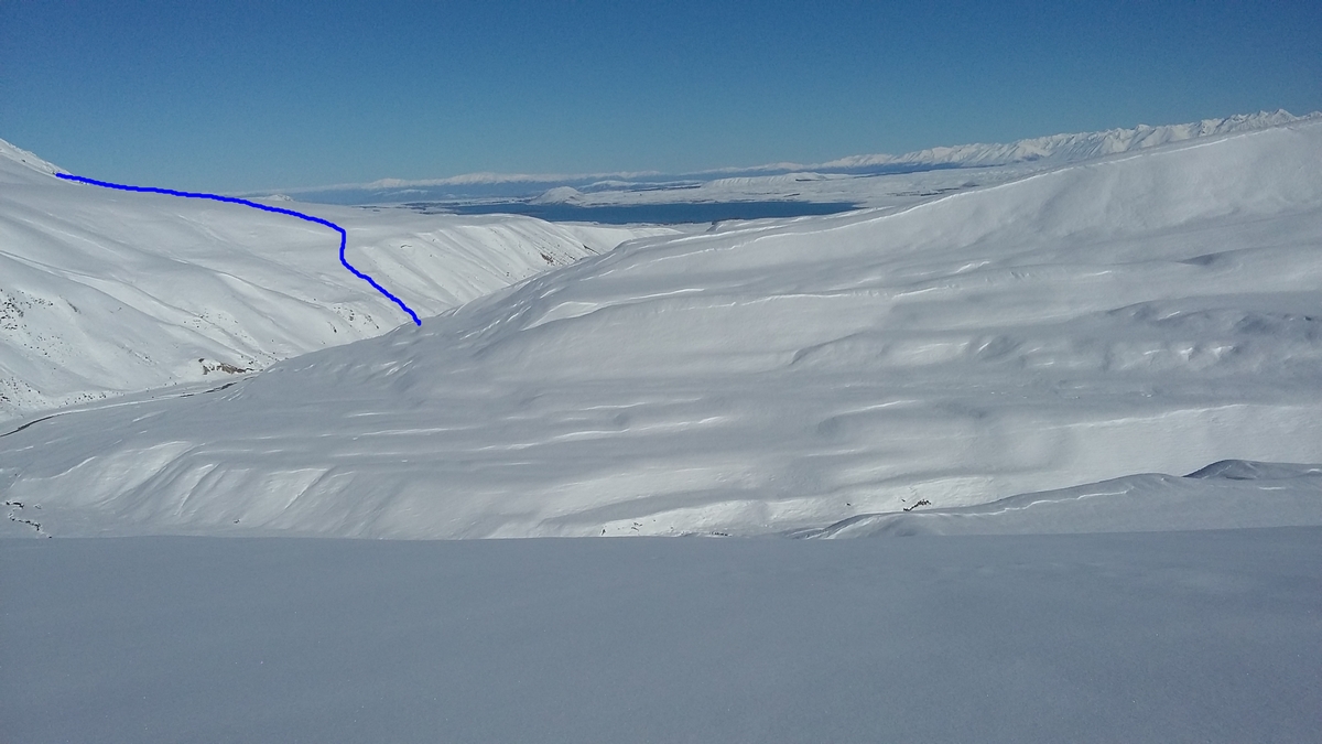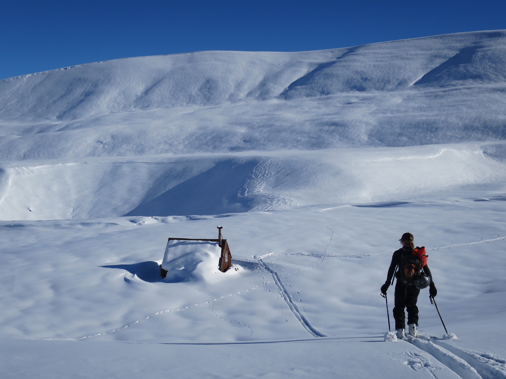 Another ‘loop’ option is to tour up Camp Stream, over Stag Saddle, and down to Royal hut, to return via a different valley. The best snow conditions for this might be when the snow is firm and fast. In soft conditions or deep powder, a lot of pushing and polling may be required to get down the reasonably gentle valleys.