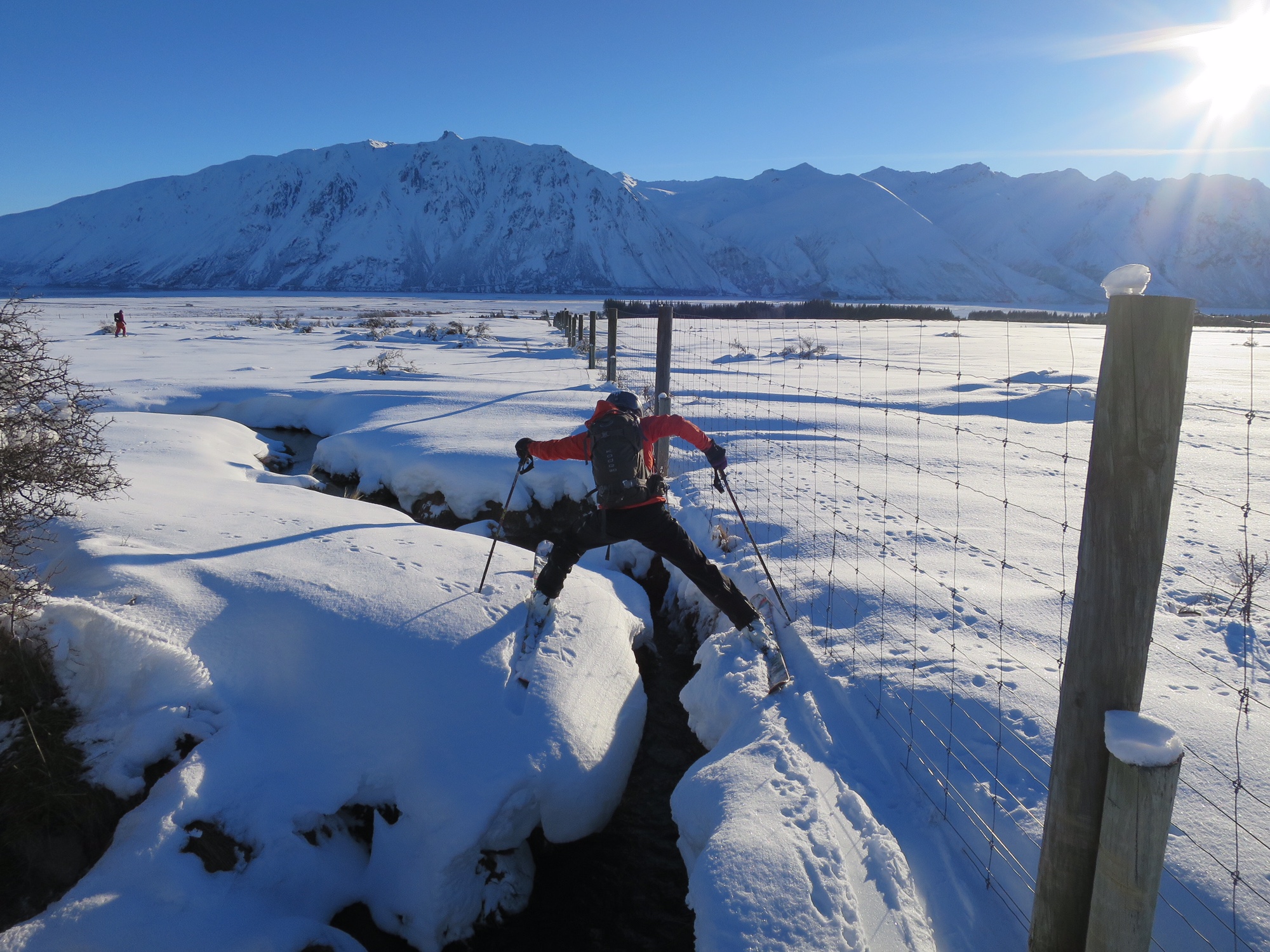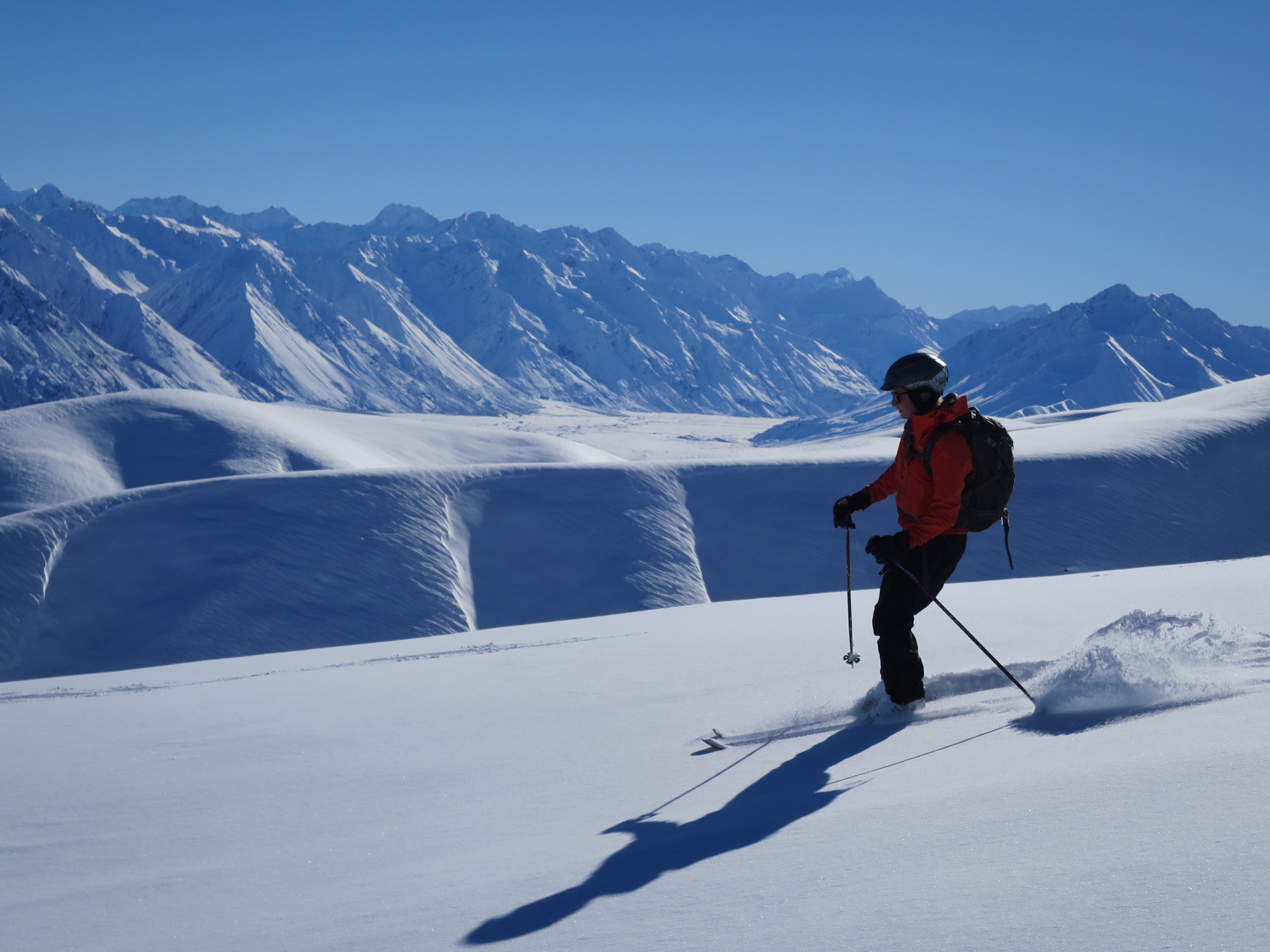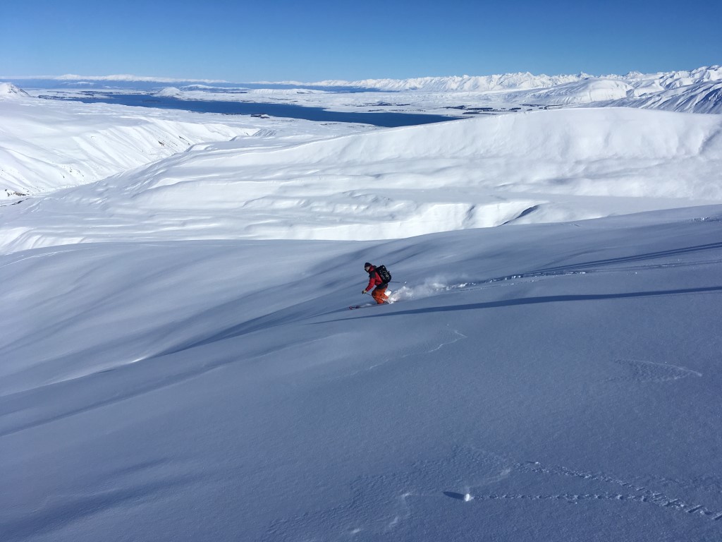 Once or twice a winter, a strong Easterly or South Easterly front pushes snow into the McKenzie Basin. Snow falls to low levels, often affecting SH8, and leaves Mt Cook Village and Tekapo township with 20cm of snow on the ground. When this event happens it is time to head into the Two Thumb Range. There is the saying ‘winds from the east, three days at least’. So if there is an easterly day of storm conditions it may well be followed by gentler easterlies and good ski conditions. Cold clear skies and morning easterly cloud will mean ice cold conditions in Camp Stream (which is somewhat of an ice box) and you may well find the valley full of squeaky dry powder.