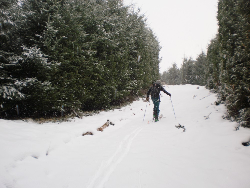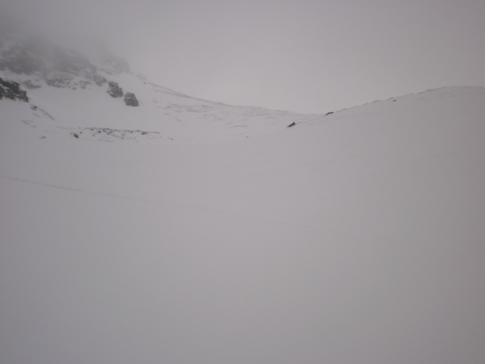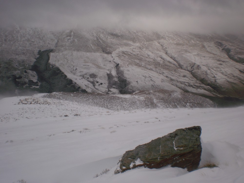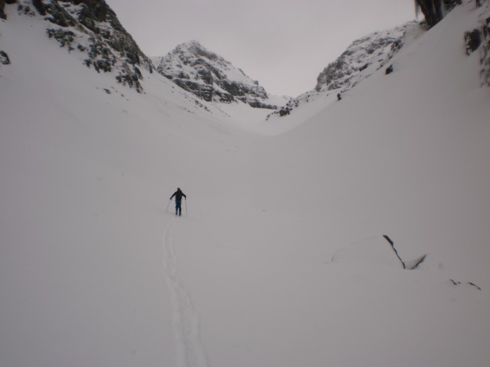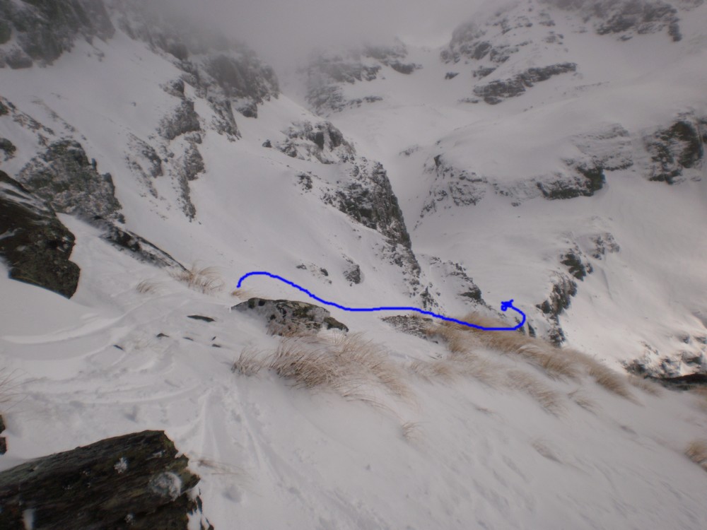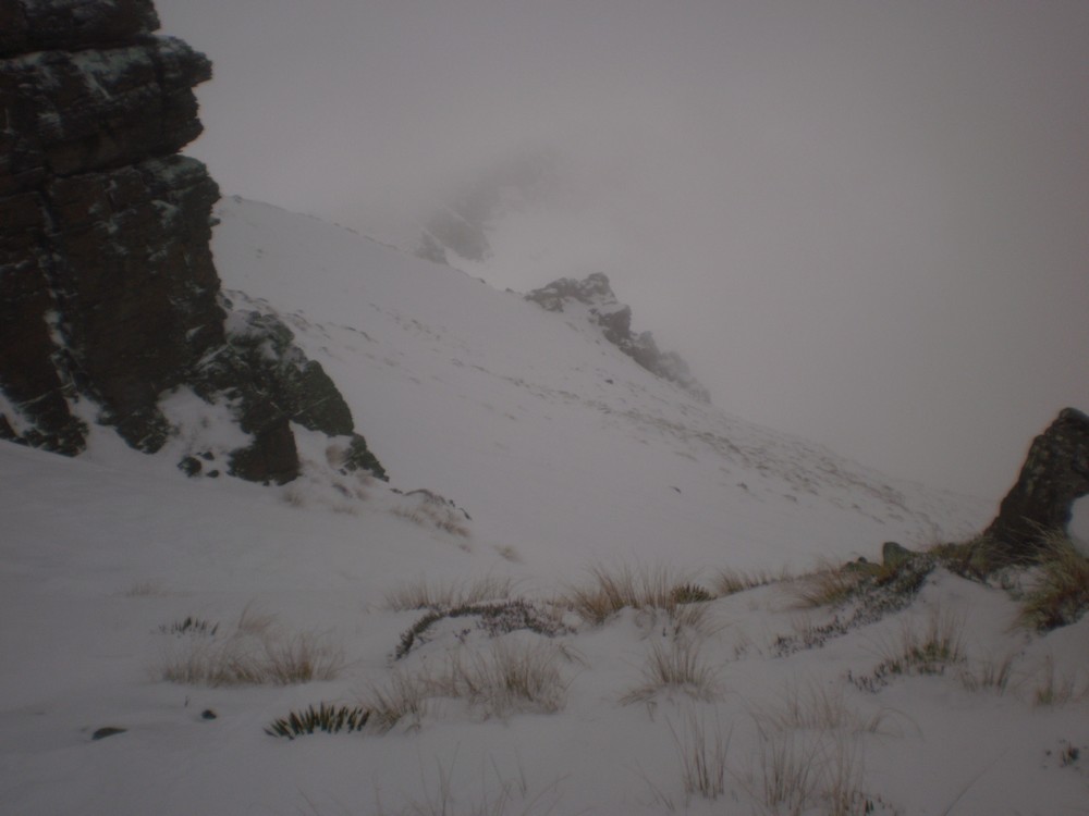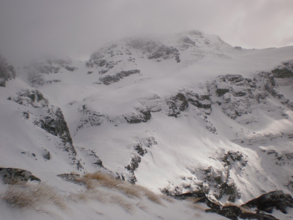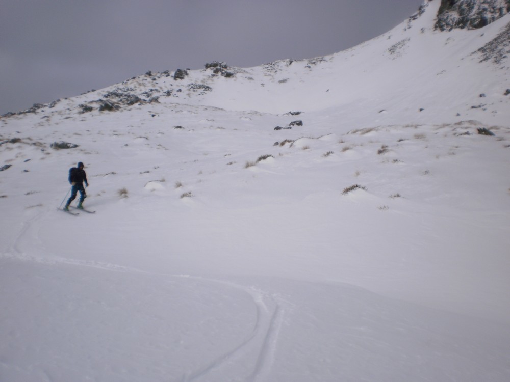 Anyhow head up Robert Creek to the Ross Spur. Make sure you take a good map with you or you might find yourself lost in the forestry block. Ross Spur is signposted!! Driving up the spur is not permitted, however we had skis on from the car at 60om and toured up through the pine forest with snow falling, making us feel like we were in Canada eh. Tree line is at about 8-900m, followed by tussock land and shrub. The track is clear and easy to follow. Look for an obvious fence-line at about 1150m to help with your bearings. Sidle around to the North at about 1400m, to find a bench that leads to a gut which in turn leads to the shelf below Symmetry Peaks. Route finding is a little tricky here, and can look quite improbable. However it is straight forward and low angle if you get it right. We transitioned from skins and skied in a downward traverse to gain the gut just above a small waterfall, that leads to the peaks. The gut provides straightforward, sheltered travel up to the main shelf, which itself is low angled easy terrain.