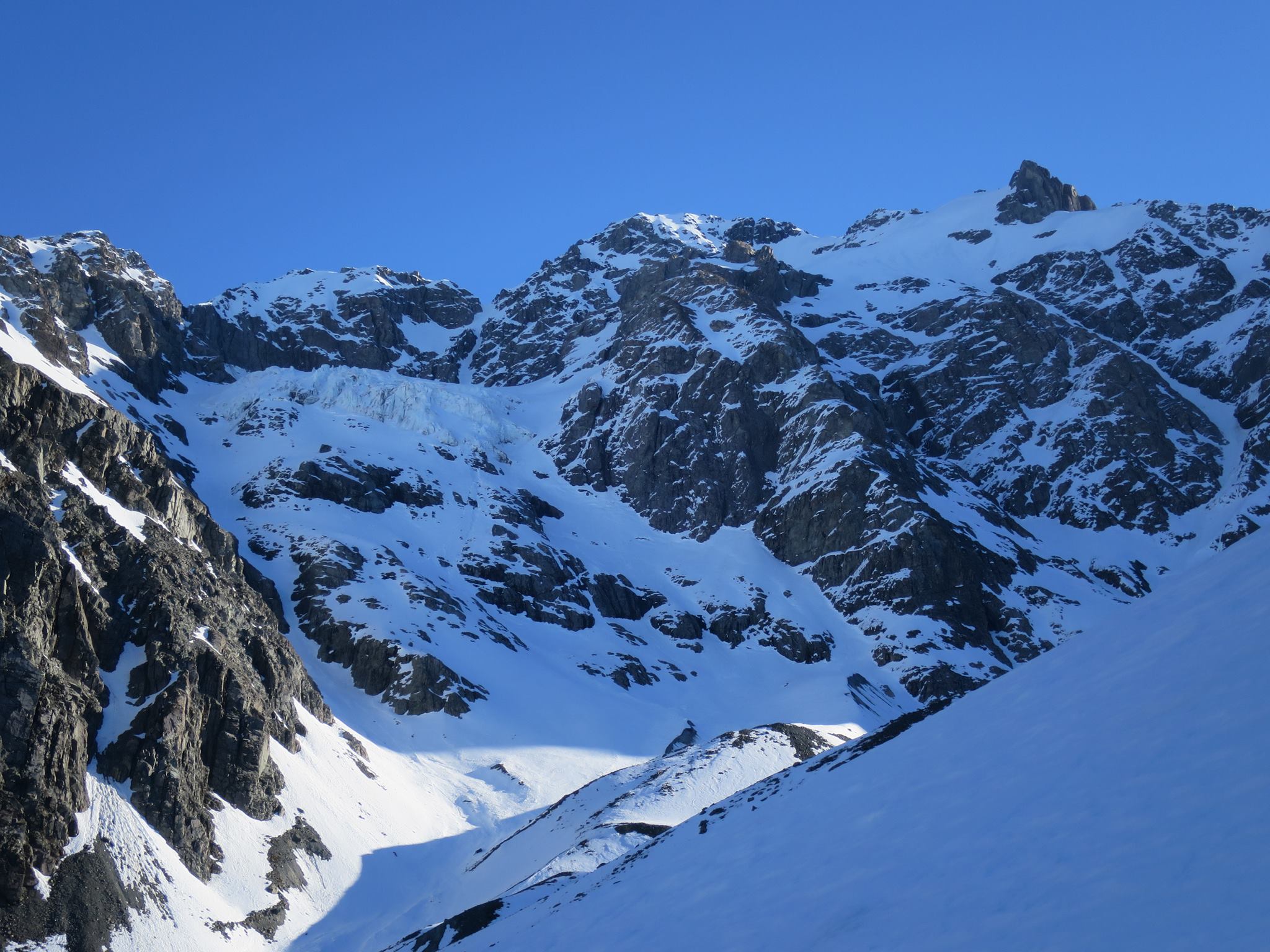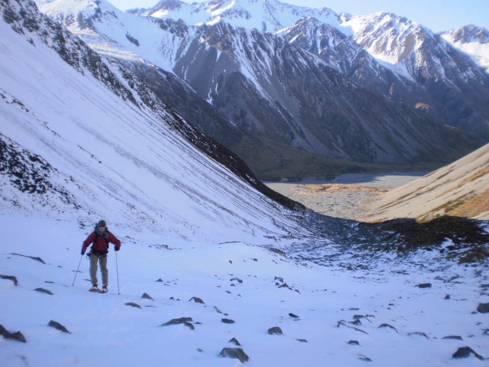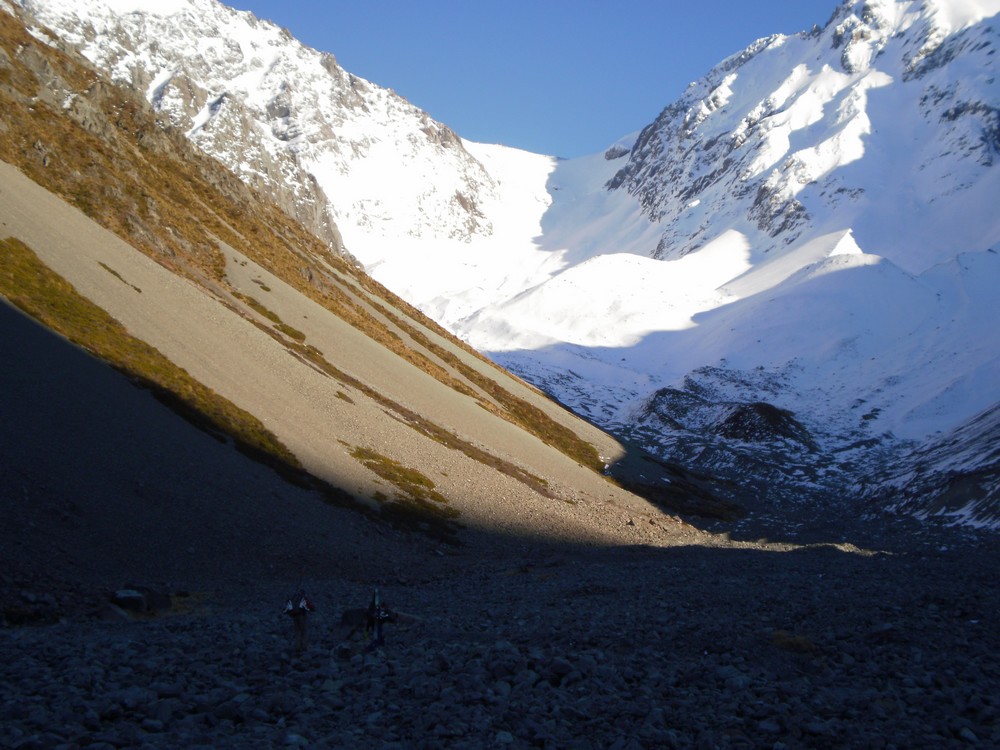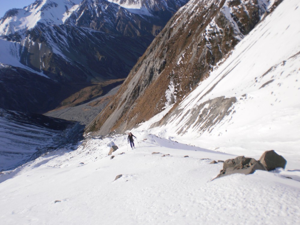 No 4wd access is permitted past the hut so it is skis on the back and walking. There is a reasonably good track leading out from the hut to the upper Tindill Stream which is quite expedient. The valley doesn’t catch a lot of sun so you can expect to be skinning within an hour from the hut. The initial section of the Upper Tindill Stream goes very quickly with straight forward valley travel and eventually skinning, with some very interesting terrain with giant medial moraines, and even a wee frozen lake at 1650m. Tend towards the true right on the way up to avoid going up and down the moraine walls.