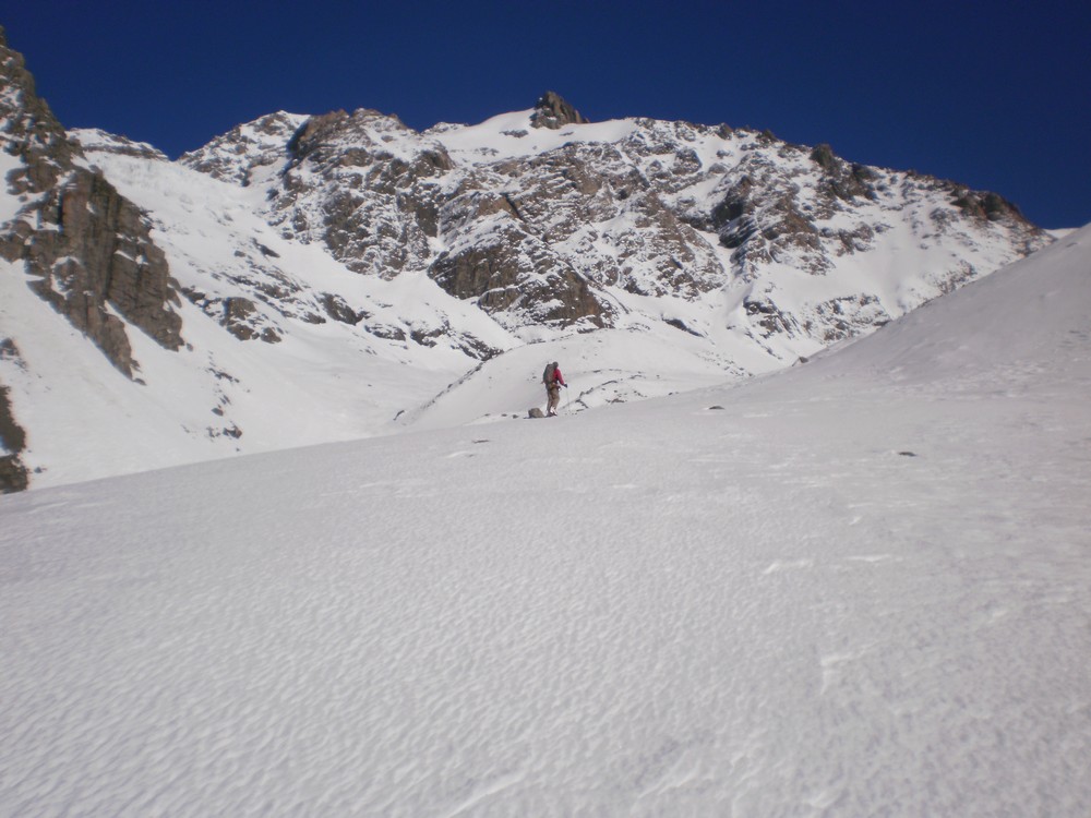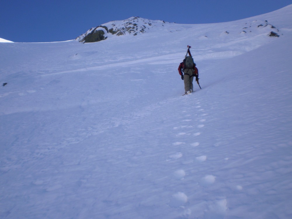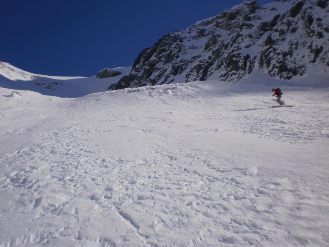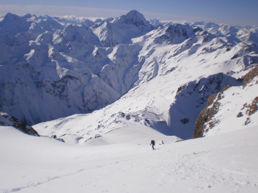 The section from the wee tarn to the col is a massive 650 m skin. It doesn’t look like it from the bottom but it is. The gradient is such that it is possible to skin right up to a bottleneck at about 2200m where the valley and glacier narrow. Here it might be necessary to crampon through. The slope is about 40 degrees with a few small bergschrunds. Crampons, axe and a length of rope are advisable. This area would load heavily with wind-loading, and the whole valley is threatened from many aspects should the avo hazard be anything other than relatively low. Use judgement. Once on the ridge the angle and effort ease way back, and the views are excellent of DÁrchiac and the terminal lake of the Classen.