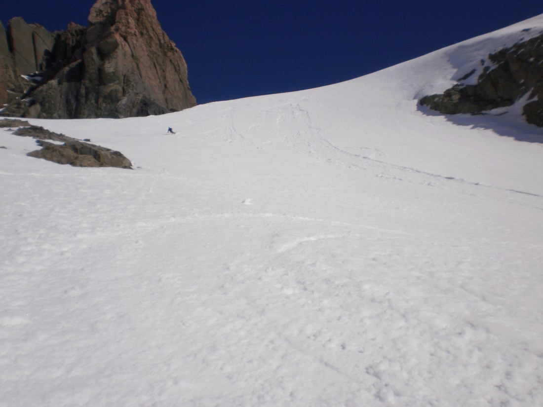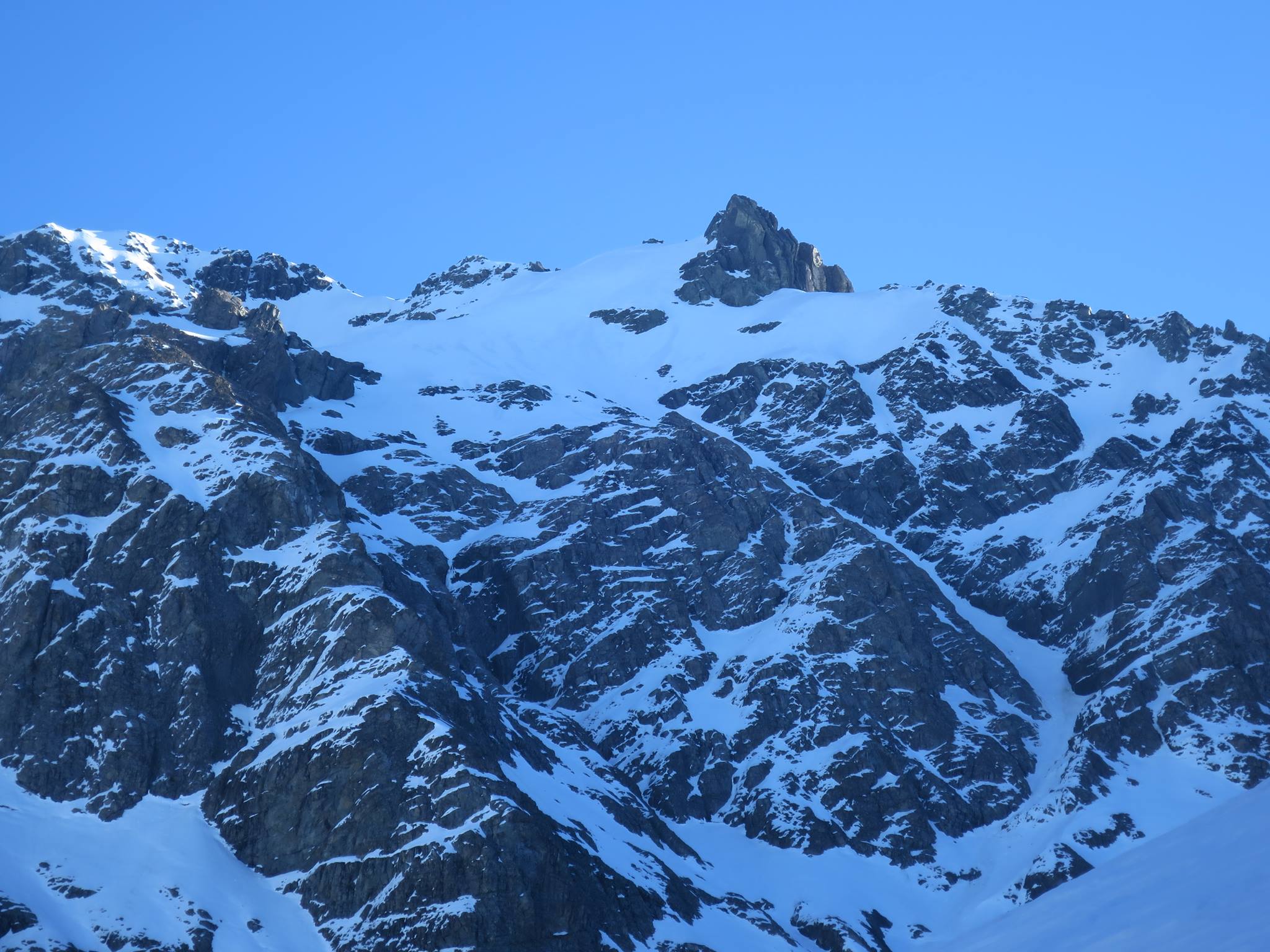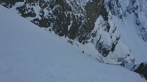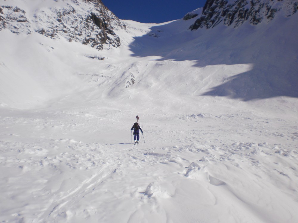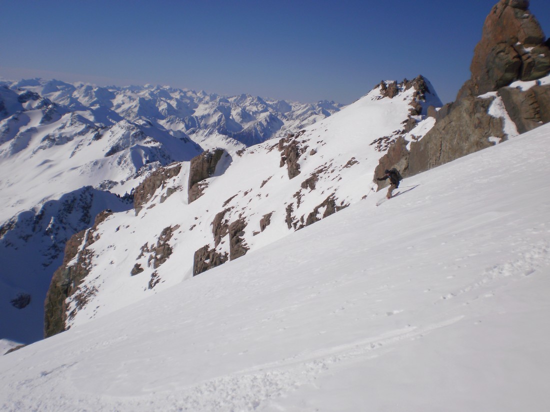 The section from the wee tarn to the col is a massive 650 m skin. It doesn’t look like it from the bottom but it is. The gradient is such that it is possible to skin right up to a bottleneck at about 2200m where the valley and glacier narrow. Here it might be necessary to crampon through. The slope is about 40 degrees with a few small bergschrunds. Crampons, axe and a length of rope are advisable. This area would load heavily with wind-loading, and the whole valley is threatened from many aspects should the avo hazard be anything other than relatively low. Use judgement. Once on the ridge the angle and effort ease way back, and the views are excellent of DÁrchiac and the terminal lake of the Classen.