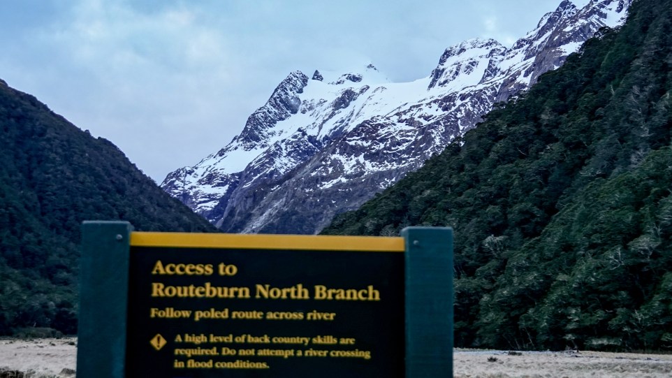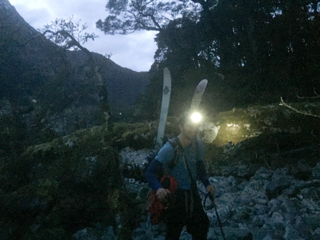 Two hours of walking from the Routeburn car-park placed us at Routeburn Flats Hut for a few hours of sleep before awaking at 4:45am to get ready and leave by 5:30am to start the trek up the North Branch of the Routeburn track to the base of the Somnus Couloir. The Routeburn track itself is a small road that runs through the mountains, well marked, well maintained… The north branch track is what could be described as ‘loosely marked’ and ‘difficult to follow’. After a couple of hours of difficult travel in the dark, the light started to break for the day and we were close to the bottom of the couloir (thank god).