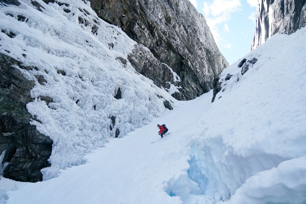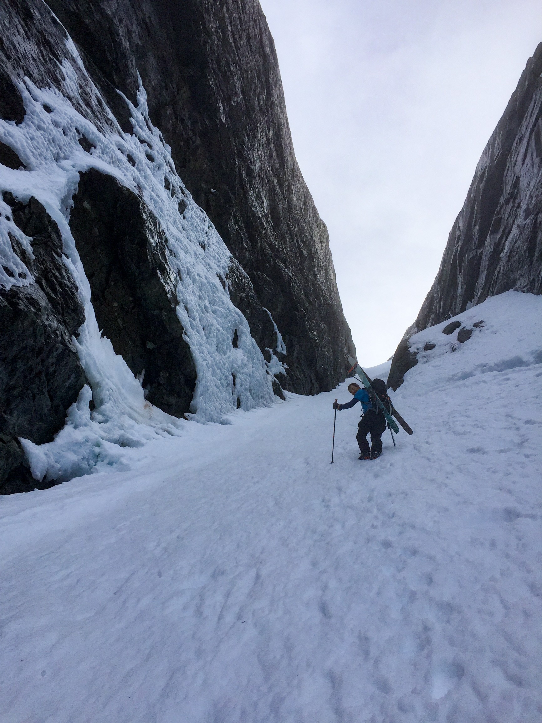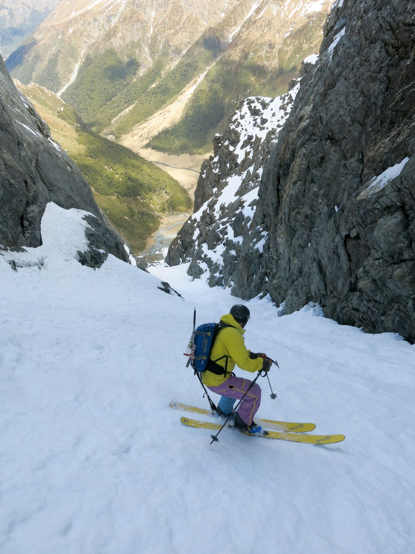 Photos do lie somewhat, the snow, for the most part in the couloir, was firm and there were certainly some hesitant turns and efforts to push thoughts of falling and sliding away.