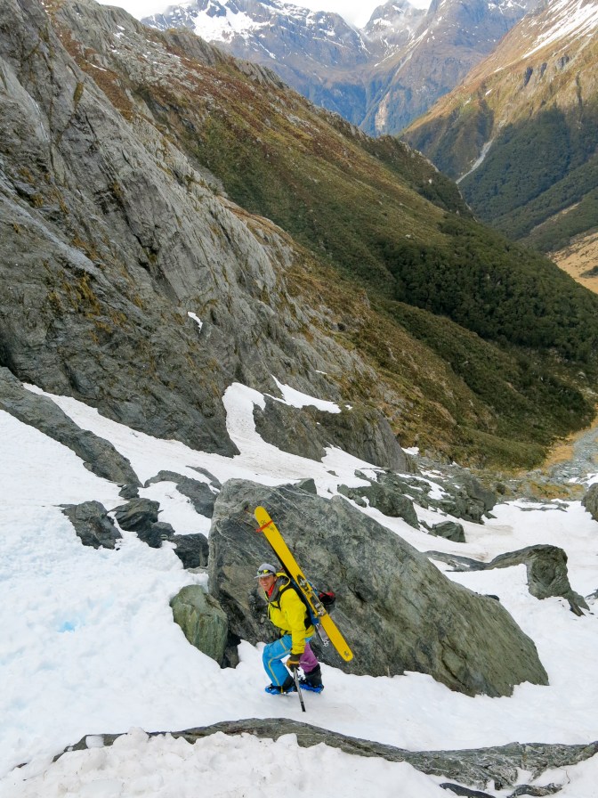 Another boots off river crossing (this would be number 2 of 4 for the day) and the ascent up through the grass and riverbeds to the base of the giant Somnus Couloir. It ascends as a couloir some 900 (!) vertical metres up the mountainside and opens up access to the glacial plateau at the top and the comparatively small knob of the summit of Somnus mountain.